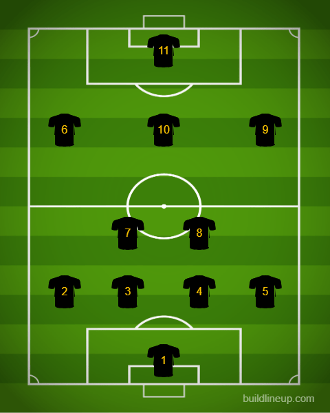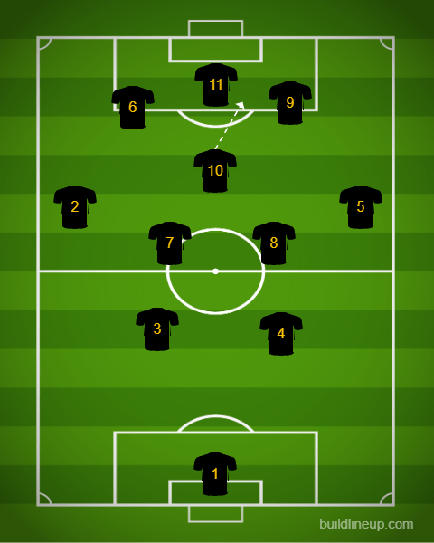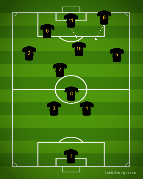 You can see here the Number 10 passing the ball into space either on the left or right of the Number 11. This allows the 10 to dictate play and allow the striker (11) to get on the ball or even leave it for the two other forwards with him (6 or 9). We had several great examples last night with Prosper and Enzo. See Below: