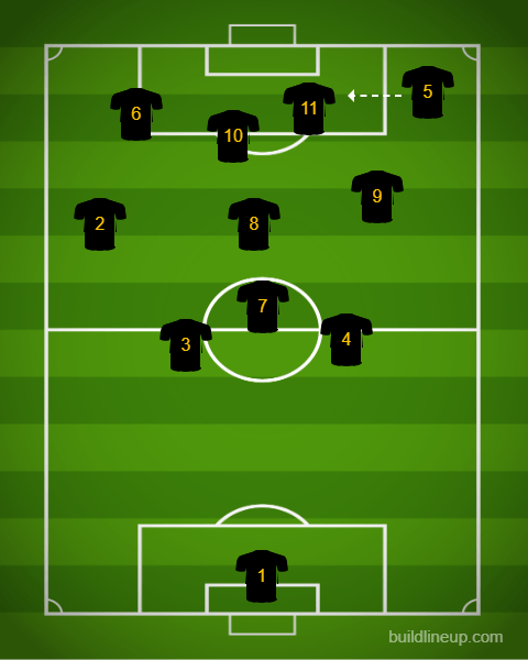 We see here the Number 5 (typically Jonny Dean) simply crossing the ball to our Number 11 (Macky, Marlon, Edi, or Juan) in the air. This is direct service, which works very well for big bodies like Macky, Edi, or Juan. See Below: