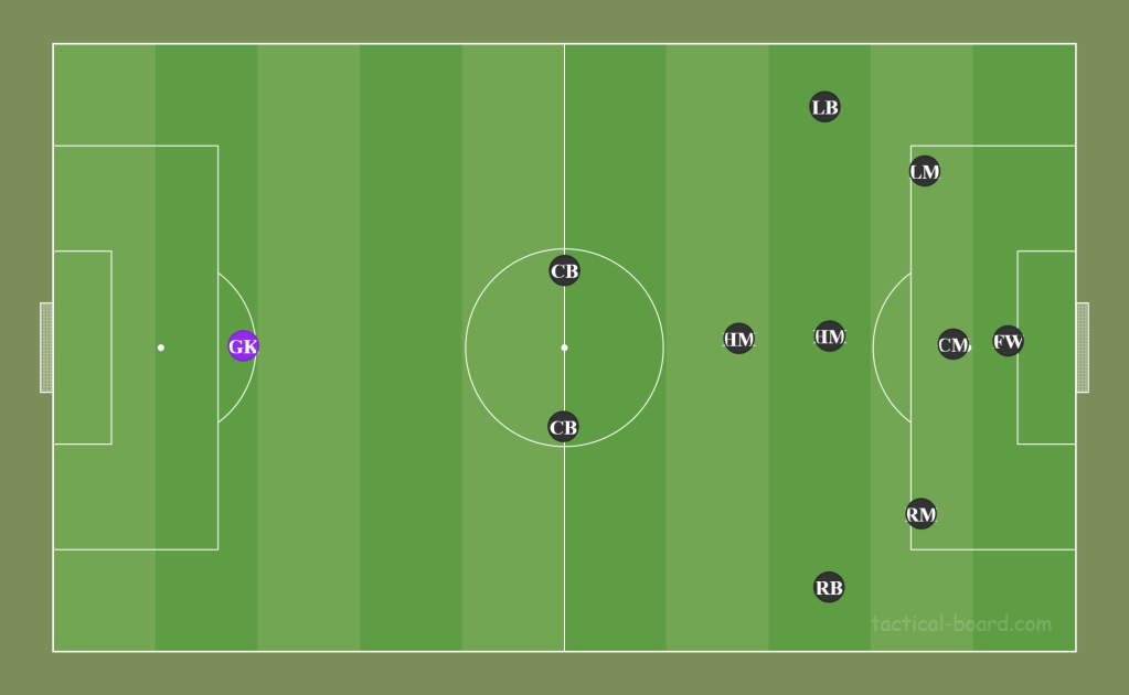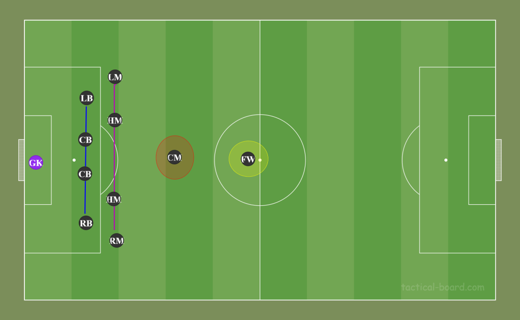 You can see it labeled with the blue line being the “backline”, the purple line is the “holding midfield”, the red is the “attacking midfield”, and the yellow circle is the striker. In the back, is the GK who is not counted.