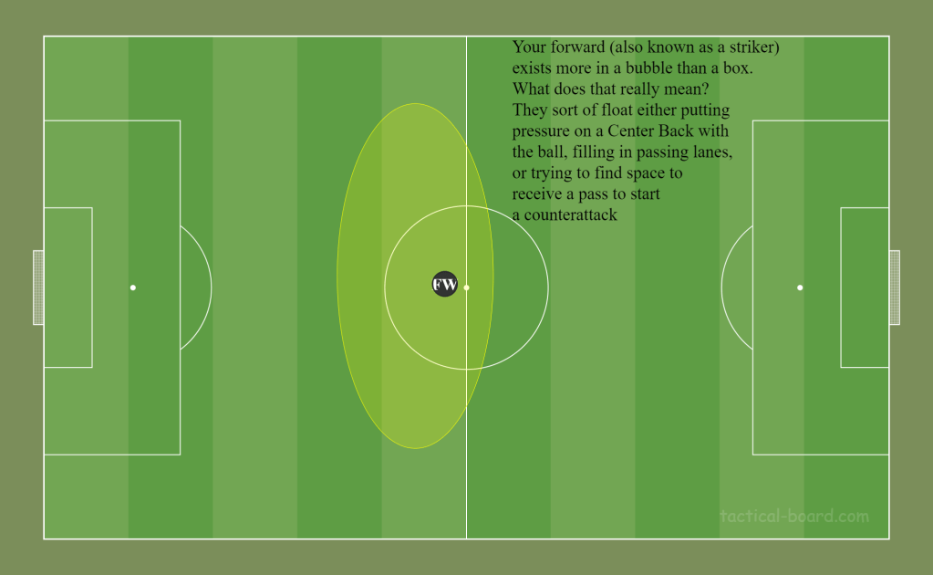 This is the first player have seen exist outside of the “box.” The striker is meant to float, stay centralize, but essentially roam throughout the circle. That roaming is to pull defenders into poor positions, to cut off passing lanes, or to just find free areas to create a counter attack.