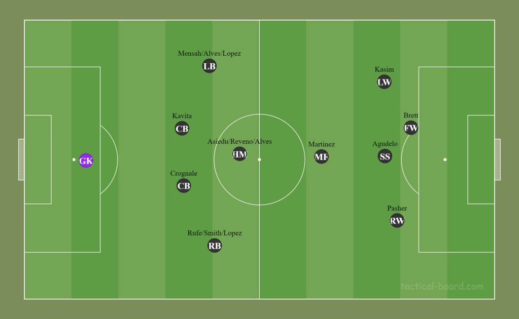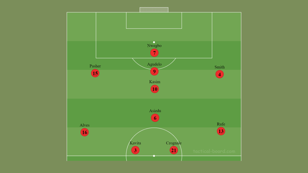 This 4-1-4-1 ended up with variations of 4-2-3-1, often with Prosper Kasim dropping in behind as a pseudo-CAM, Diba Nwegbo as the pressing striker, and Juan Agudelo as a left winger.