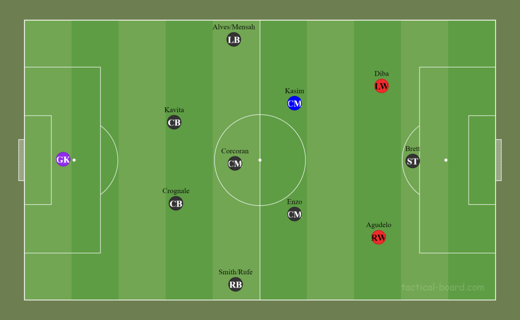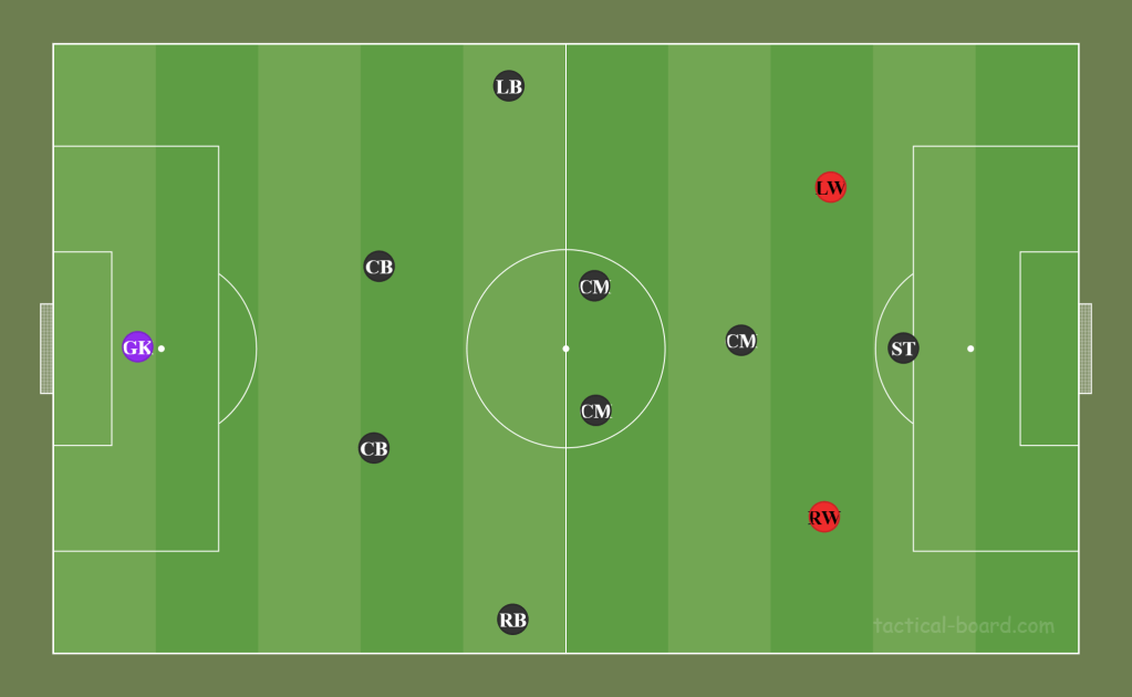 In Legion’s 4-2-3-1/4-3-3 that they have been running, you truly only have the space for two wingers at a time on the pitch, as you can see above. The red circles are to represent the wingers on the team. Now, our most recent line ups have looked something like this.